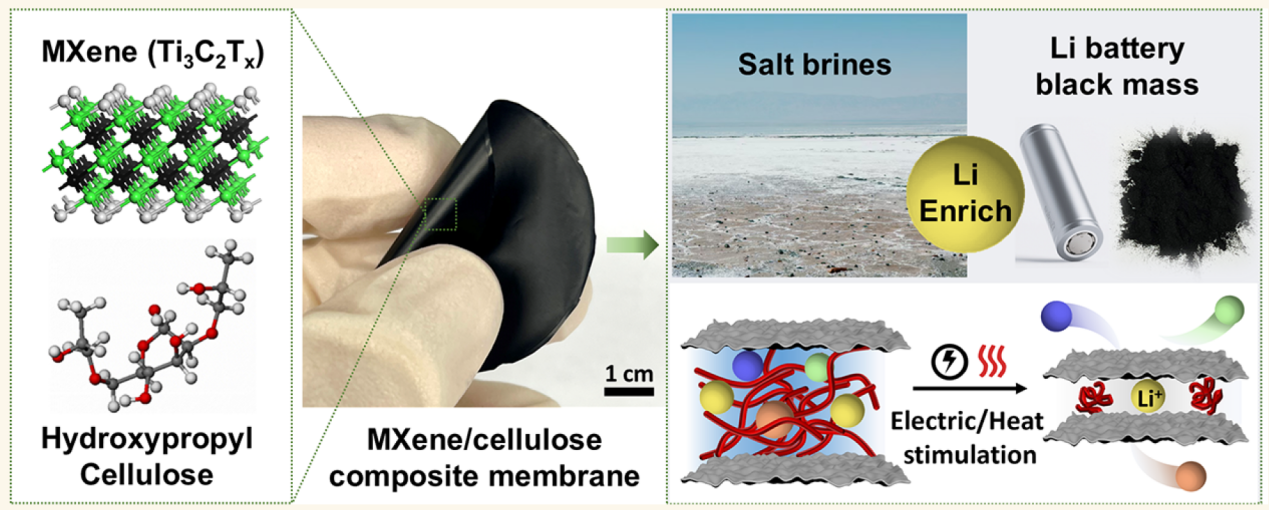 锂作为锂离子电池的核心材料,在可再生能源系统和电动交通迅猛发展的背景下,其全球需求持续攀升。该工作成果研制出一种基于Ti₃C₂Tₓ MXene与羟丙基纤维素(HPC)的纳米受限温敏复合膜,可用于锂离子(Li⁺)的高选择性提取。该复合膜融合了MXene优异的电热传导性能与HPC的水合响应门控特性,构建出具有可调控间距的异质通道结构,借助纳米限域效应实现了基于离子水合半径和相互作用能差异的精准筛分与传输调控。