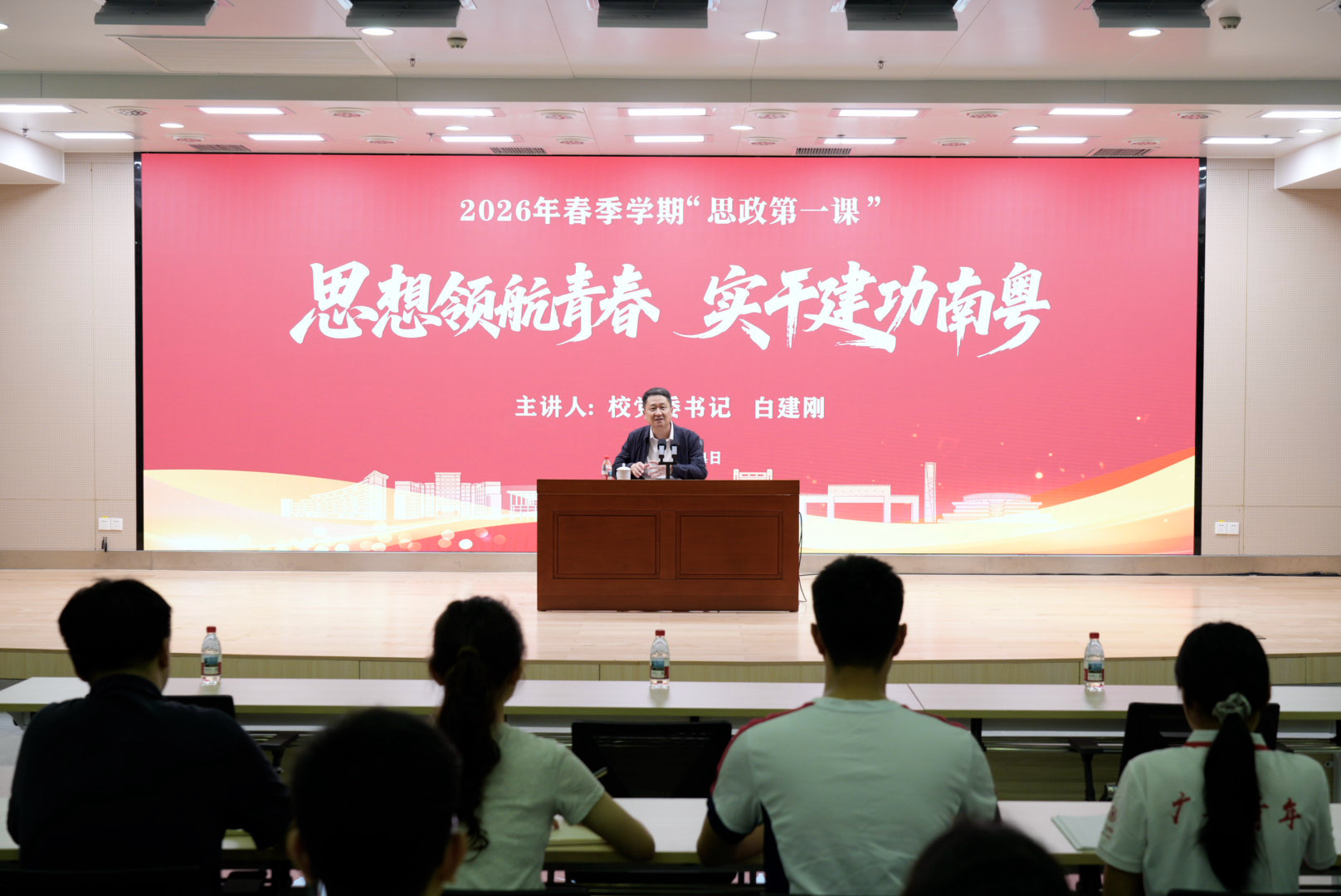 4月14日下午,学校党委书记白建刚以“思想领航青春 实干建功南粤”为主题在大学城校区青春报告厅,讲授2026年春季学期“思政第一课”暨专题党课,引导广工青年在回顾“十四五”成就中感悟思想伟力,在展望“十五五”蓝图中把握青春机遇,在践行使命中实现人生价值,激励大家以青春实干扎根南粤、建功时代。学校青马工程培训班学员、学生骨干及十五运会志愿者代表等百余名青年学生,学校党办校办党支部全体党员参加学习。