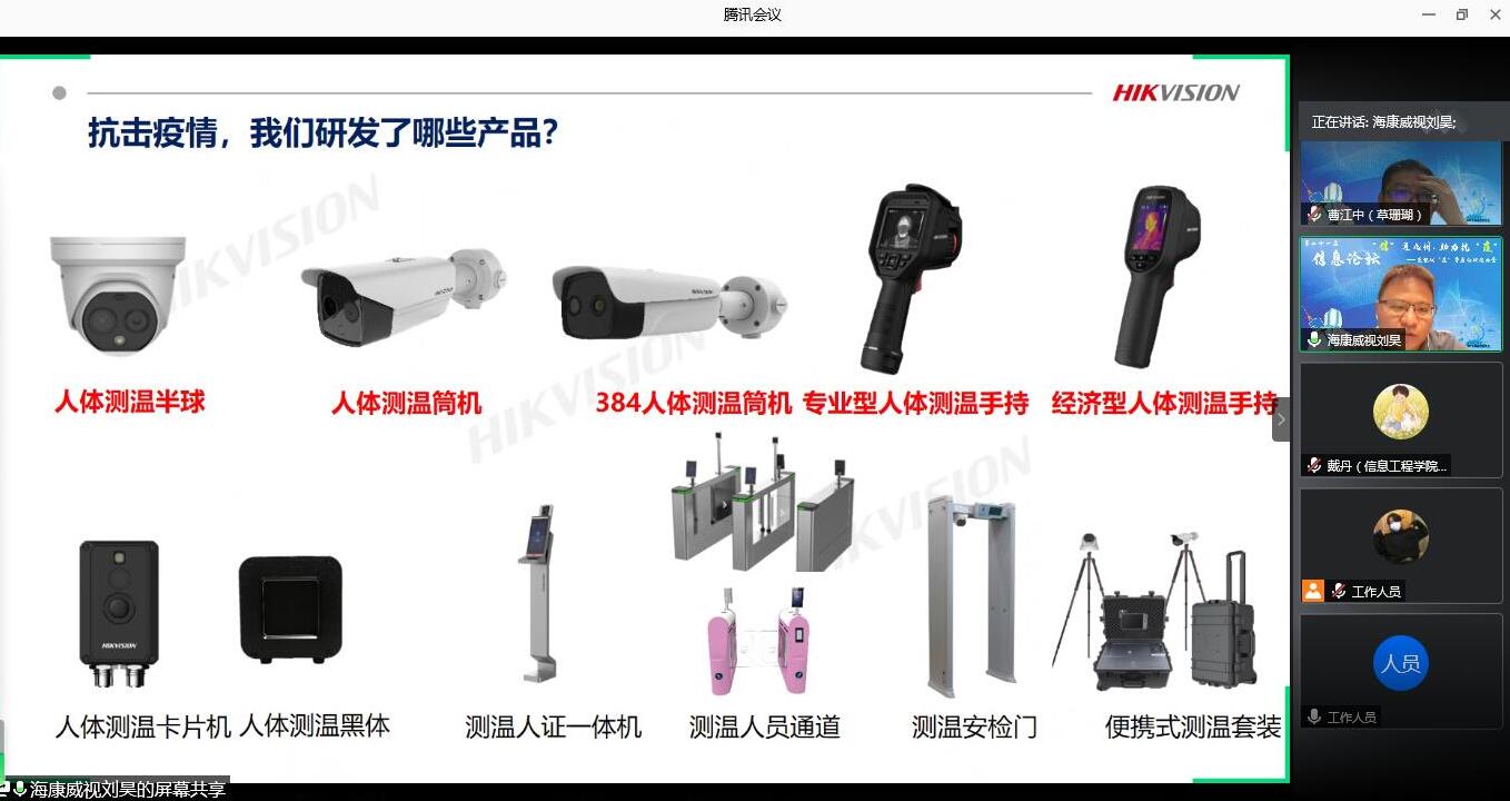 海康威视广东业务中心产品总监刘昊讲述了海康威视运用科学技术筑成了抗疫后方队伍,助力各行各业抗击疫情,复工复产复学。疫情暴发后,海康威视红外测温产品马不停蹄地发往武汉,安装在当地医院,有效进行高精度体温筛检,扎牢疫情防控“第一道防线”。海康威视与央视网合作的“直播-战‘疫’最前线”项目中,海康威视负责提供前方信源感知接入服务支持,将视频流接入至央视网的“直播中国”平台,让各地关切“火神山”医院与“雷神山”医院建设进展的网友可以通过观看直播当上了“云监工”,总观看量超2.5亿人次。结合以上案例,刘昊以红外测温产品为例给同学们介绍热成像人体测温原理、热成像相机的组成、热成像体温初筛的业务流程、产品市场化需要具备的特点,使同学们更加深入的了解到了战疫背后的信息技术力量。