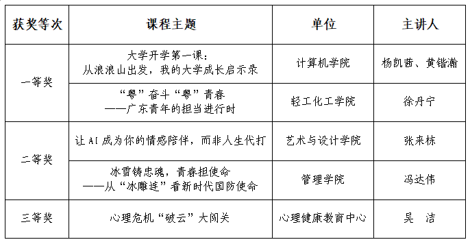 近日,广东高校网络思想政治工作中心、广东高校易班发展中心面向全省高校组织开展的2025年度广东高校新生入学教育微课征集活动结果公布,我校成绩优异,推选作品全部获奖,分别是一等奖2项、二等奖2项、三等奖1项,具体获奖名单详见下表。祝贺获奖的老师们!