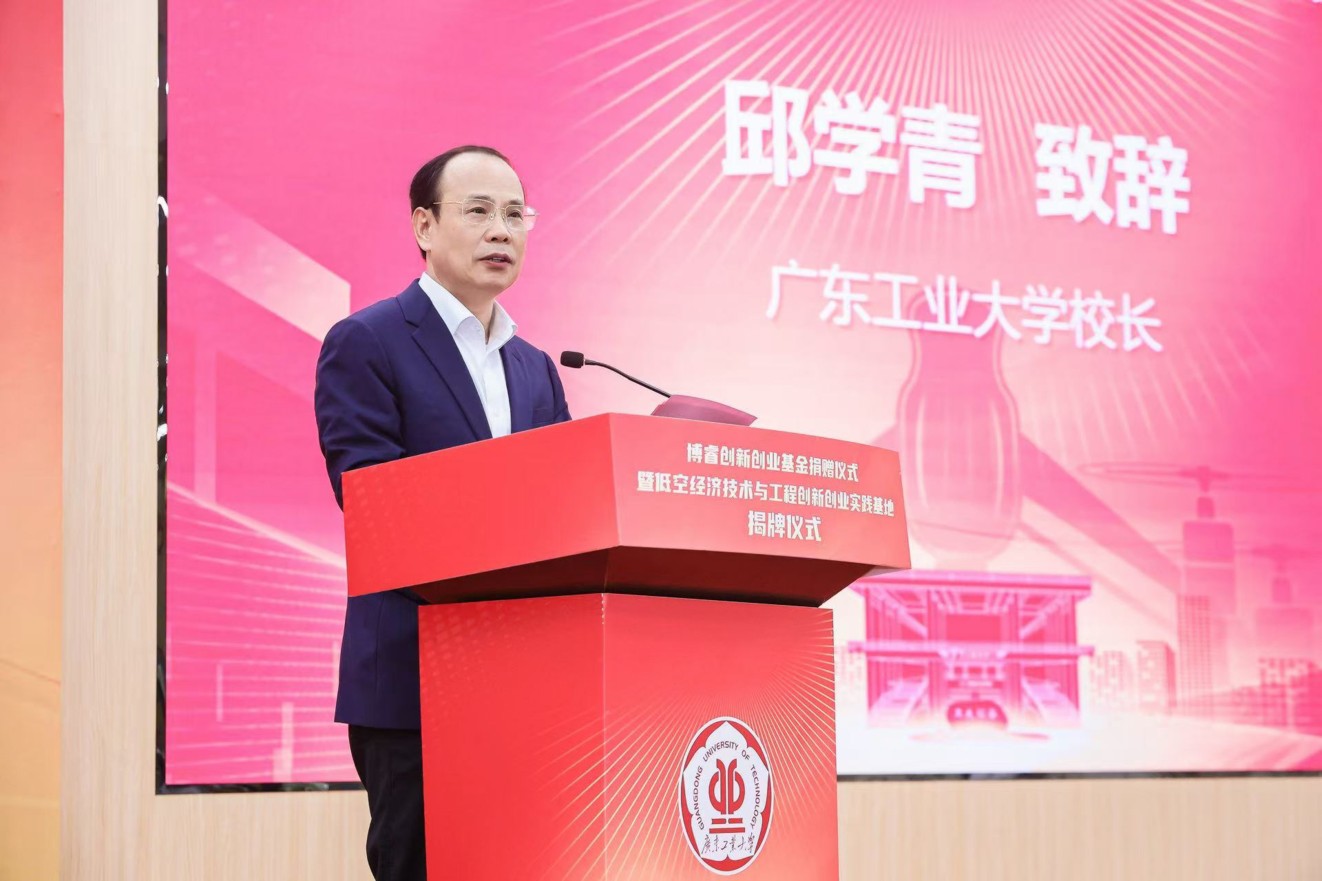 邱学青在致辞中强调,学校始终将创新创业教育贯穿人才培养全过程,积极构建“教育—实践—孵化—成长”为一体的创新创业生态。校友陈顺成从校园创业者成长为企业家并深情反哺母校,正是学校创新创业育人成果的生动写照。他指出,低空经济作为国家战略性新兴产业,亟需大批高素质复合型人才支撑。学校依托扎实的工科底蕴,携手企业共建实践基地,是深化产教融合、服务国家战略的关键举措。在学校奋力建设高水平创新型大学、冲刺“双一流”的关键阶段,期待通过校企协同,实现教学科研与产业市场深度融合,构建“学科交叉、产教协同、项目驱动”的人才培养新模式,培育“懂技术、能创新、会创业”的新时代人才,孵化一批具有核心竞争力的创新企业,进一步擦亮广工创新创业的“金字招牌”。他欢迎更多投资机构与校友企业融入学校创新创业生态,共同为服务经济社会高质量发展注入新动能、贡献“广工智慧”与“广工力量”。