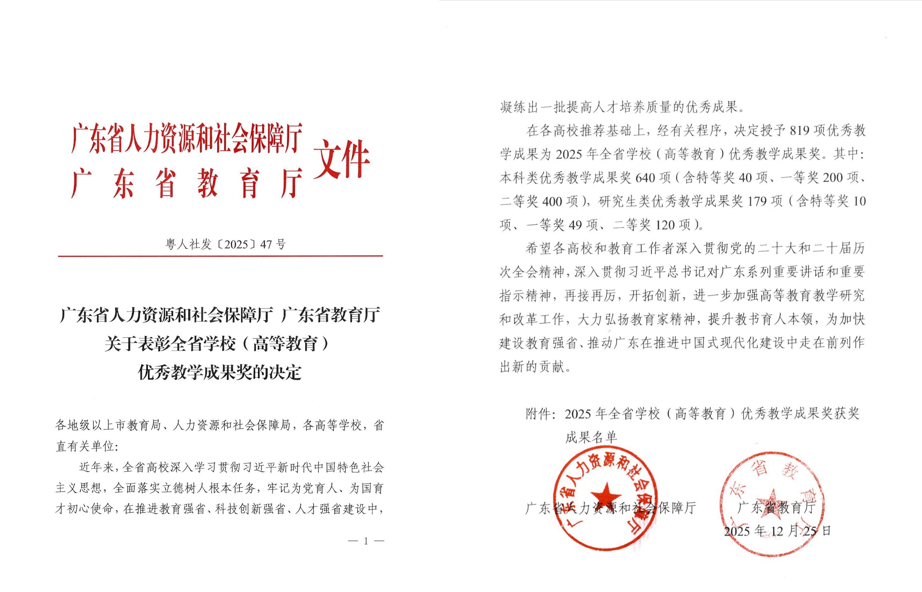 广东省优秀教学成果奖是我省教育教学领域的最高荣誉,旨在表彰教育教学工作中取得突出成果的集体与个人,激励广大教育工作者坚守立德树人初心,积极探索新时代教育教学规律,破解教学实践难题,持续提升人才培养质量。荣誉是对学校落实立德树人根本任务、深化教育教学改革的成效凝练和经验推广,也是对广大教师投身教学研究、持续探索创新的充分肯定。学校将继续紧密对接国家战略与区域发展需求,进一步发挥学科专业优势,强化科研反哺教学,培育更多具有示范引领作用的高水平教学成果,为加快建设教育强国、推动广东在推进中国式现代化建设中走在前列作出新的更大贡献。