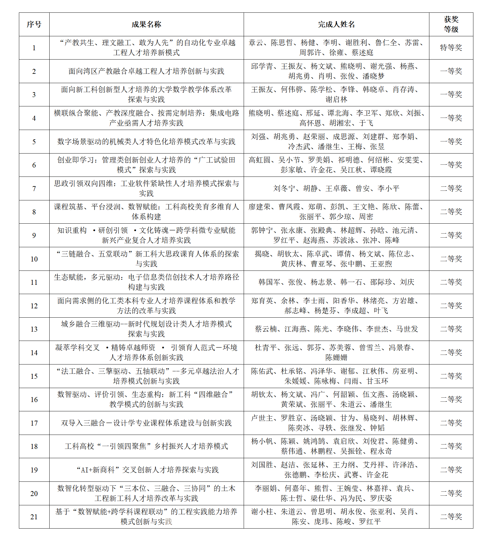 2025年全省学校优秀教学成果奖(高等教育-本科类)获奖成果名单(广东工业大学)