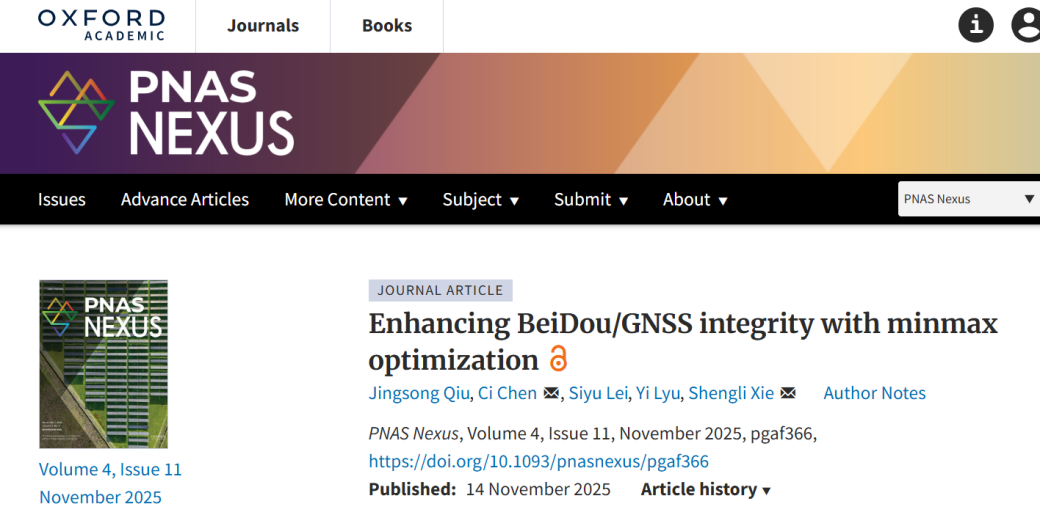 近日,广东工业大学谢胜利教授团队在北斗卫星导航完好性监测取得重要进展,提出了一种针对北斗/全球导航卫星系统接收终端的最优接收机自主完好性监测新策略,该策略通过创新性地采用极大极小估计器,优化分配完好性和连续性风险,实现了垂直保护水平的全局最小化,有效提升了导航系统在航空等安全关键领域的可用性。相关成果发表于美国国家科学院院刊(PNAS)唯一的子刊《PNAS Nexus》上,论文第一作者为2023级博士研究生邱劲松,自动化学院陈辞教授和谢胜利教授为共同通讯作者。