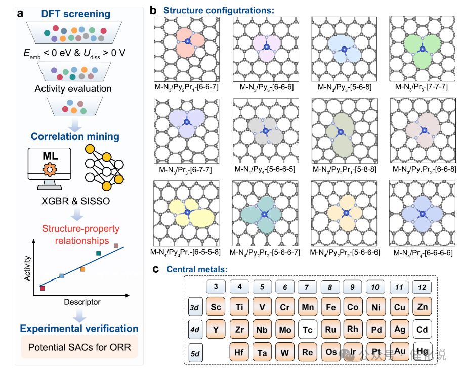 单原子催化剂以其原子级分散的活性位点和卓越的催化性能成为催化研究的前沿,本研究创新性地融合高通量DFT计算与机器学习数据挖掘,系统筛选了26种过渡金属中心与12种配位构型的组合,从复杂数据中提炼出关键描述符Eemb/sin(CN),该描述符同时量化了金属-载体相互作用强度与配位几何环境,统一解释了前过渡金属(如Mn、Fe)需高配位削弱过强氧吸附、后过渡金属(如Cu、Pd)可通过低配位增强中间体结合的规律。基于此设计原则,团队通过缺陷工程策略精准合成了富含Cu–N₃基元的Cu-SA/N–C催化剂,实验表征证实其局部配位结构以吡咯型氮为主,与传统Cu–N₄位点相比表现出显著优化的ORR活性:半波电位达0.886 V(vs. RHE),超越商业Pt/C(0.872 V),锌空气电池峰值功率密度达191.3 mW cm−2,并具备长期稳定性。