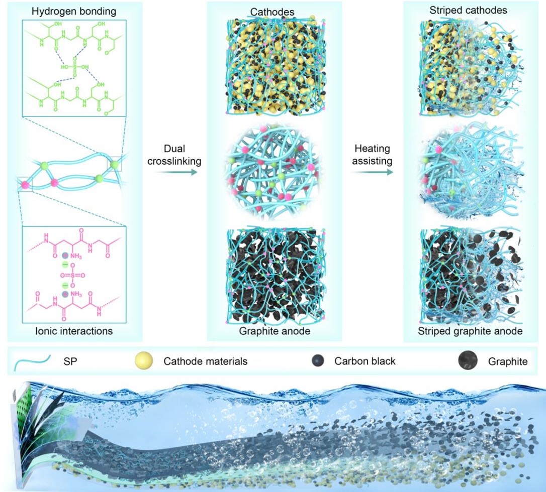 随着电动汽车产业的快速发展,全球锂离子电池装机规模持续扩大,并逐步进入集中退役阶段,电池资源高效回收与循环利用已成为能源与环境领域的重要课题。直接回收可保留并修复电极活性材料结构,被认为是退役电池回收的理想路径。然而,在实际电池体系中,粘结剂对电极组分的强粘附作用使活性材料难以有效分离,成为制约直接回收的关键因素。本研究从电池设计源头出发,开发了一种超分子水溶性粘结剂,可有效替代现有商业化粘结剂。该粘结剂对正/负极材料具有良好的兼容性,其内部构建的氢键和离子键键合相互作用可随温度升高发生解离,使其在热水中快速溶解,从而实现退役电池材料组分的高效分离和直接再生。这一工作突破了传统“先使用、后回收”的被动模式,使电池在诞生之初便具备高效再生循环利用属性,为破解锂离子电池闭环回收难题提供了关键的解决方案。