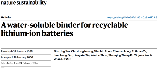 近日,我校轻工化工学院林展教授团队在退役锂离子电池直接回收再利用领域取得了原创性进展。团队聚焦于退役电池材料组分难以分离的关键科学问题,设计了一种兼容于正/负极的水溶性超分子粘结剂,利用粘结剂中的氢键和离子键键合作用,通过其在热水中的可逆解离,实现了活性材料组分的快速剥离、高效分离及直接再生利用。该设计着眼于退役电池材料组分的分离难题,颠覆了传统的电池结构体系,通过创新设计功能化粘结剂,实现了电池材料组分的“稳定服役—高效分离—直接回收利用”,简化了回收过程并节约了大量能耗。相关成果发表于Nature大子刊《Nature Sustainability》,广东工业大学为论文唯一署名单位,吴曙星副教授为论文唯一第一作者,林展教授为论文唯一通讯作者。
