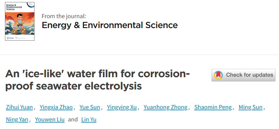 近日,我校轻工化工学院余林教授团队在直接海水电解制氢研究领域取得重要进展。相关研究论文以 "An 'ice-like' water film for corrosion-proof seawater electrolysis"为题,发表于能源与环境领域的国际顶级期刊《Energy & Environmental Science》(影响因子:30.8,中科院一区TOP期刊)。