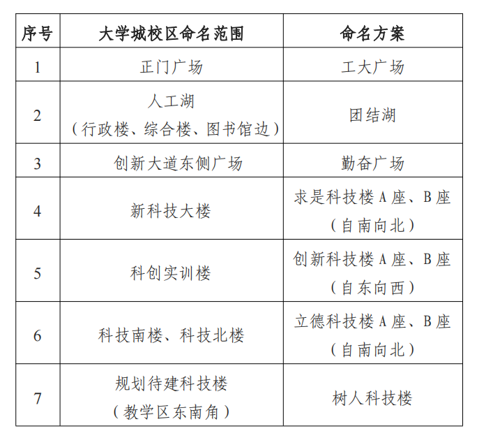 为了适应新发展新变化,塑造特色鲜明的学校文化标识,便于师生员工、来访者的日常出行和识别定位,党委宣传部组织开展大学城校区新增建筑、部分景观命名工作,经前期调研、征求意见,并经学校研究决定,现将具体命名方案公告如下: