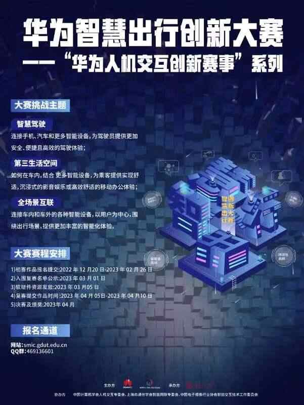 大赛分为三个主题:智慧驾驶、第三生活空间、全场景互联。参赛队伍在初赛阶段提供相关主题的文本设计方案材料,进入复赛后,将发放华为技术有限公司的软硬件资源,为创新场景提供实现落地的可能。大赛对国内外在校大学生(包括专科生、本科生、硕士生和博士生等)以及社会在职人员(华为技术有限公司及其关联公司员工除外)开放报名。报名截止时间为2023年2月26日,详情可关注大赛官方网站:smic.gdut.edu.cn。
