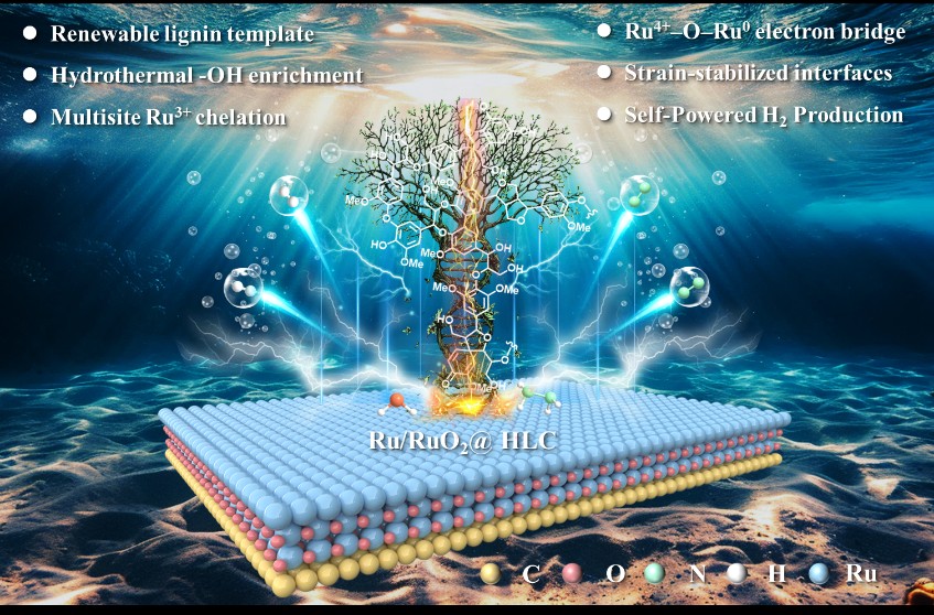 论文共同通讯作者、广东工业大学教授林绪亮介绍,该研究团队通过水热活化木质素,使其与Ru3+原位配位,再经高温碳化处理,成功还原构筑了嵌入木质素衍生分级多孔碳骨架的Ru/RuO2异质纳米界面。这一创新设计实现了低输入、可自驱动的联氨-水分解制氢过程。
