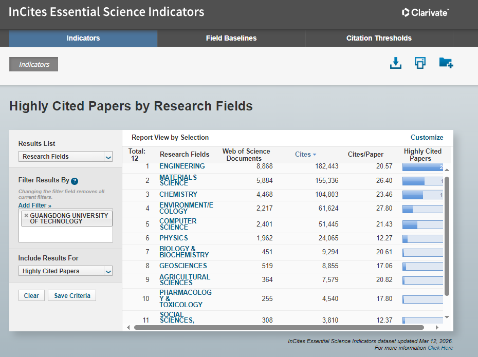 据基本科学指标数据库(Essential Science Indicators,以下简称ESI)2026年3月12日最新数据显示,广工化学(Chemistry)成功跻身ESI全球排名前1‰。至此,学校有工程学、材料科学、计算机科学、化学、环境/生态学、农学、社会科学总论、生物学与生物化学、地球科学、物理学、药理学与毒理学等11个学科进入ESI全球排名前1%,其中,工程学、材料科学、计算机科学和化学4个学科进入前1‰(工程学已进入0.258‰),前1‰学科总数并列地方高校第三。ESI世界综合排名532位,较上一期提升18位(位居中国内地高校第66位)。